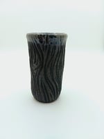 Tall shotglass is hand carved in black clay to look like a dark twisted tree in a haunted woods...