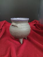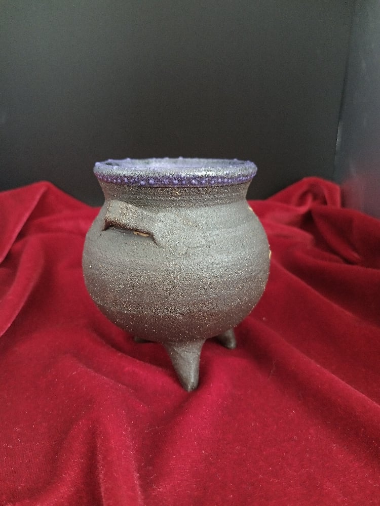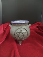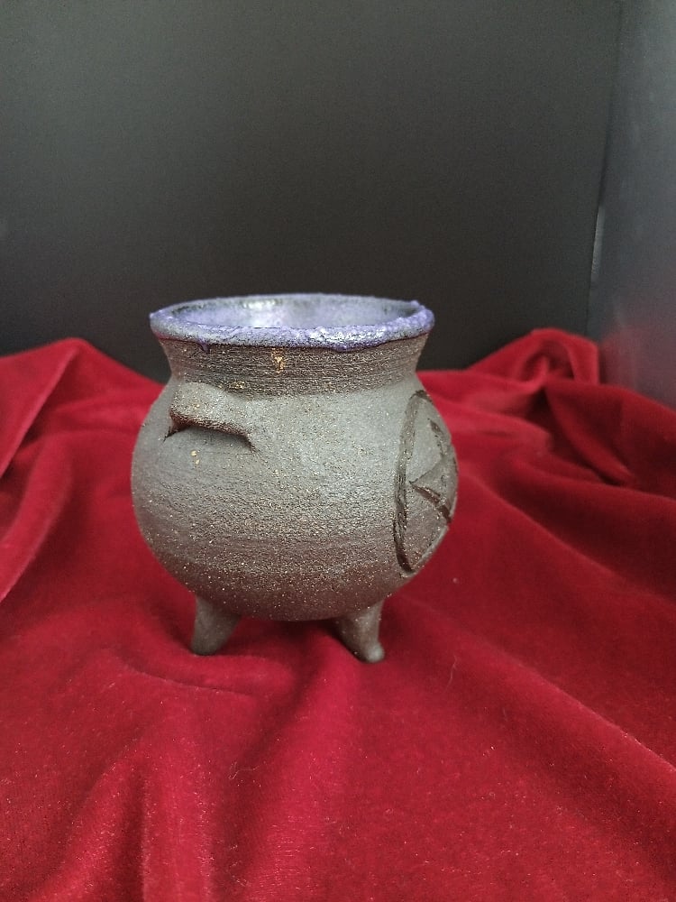 Little cauldron with a hand carved pentacle is the perfect size for burning some herbs or incense, charging water or a crystal. Wheelthrown and sculpted with black clay, this one has a drink safe liner glaze and can even be used as a shot glass.