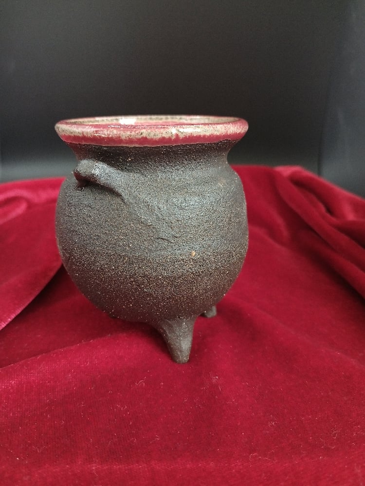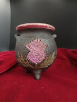 Little cauldron with a hand carved and painted Scottish Thistle is the perfect size for burning some herbs or incense, charging water or a crystal. Wheelthrown and sculpted with black clay, this one has a drink safe liner glaze and can even be used as a shot glass.
