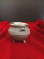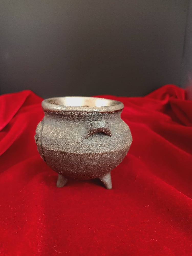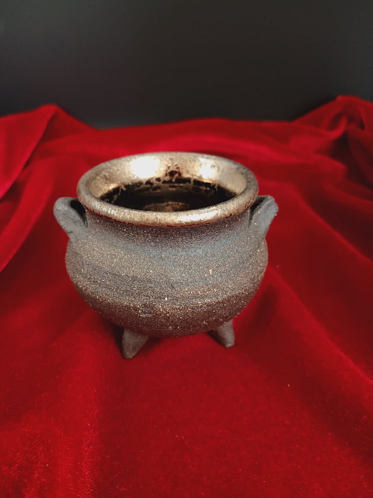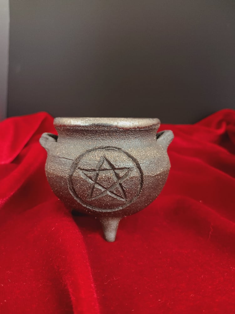 Little cauldron with a hand carved pentacle is the perfect size for burning some herbs or incense, charging water or a crystal. Wheelthrown and sculpted with black clay, this one has gold luster glaze that is not safe for food/drink.