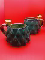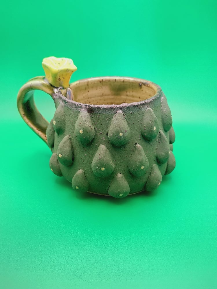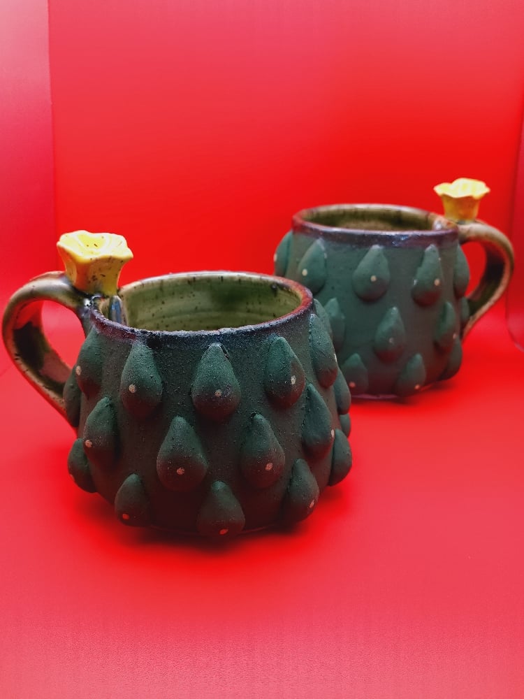 These mugs are a sculptural abstraction of the beautiful prickly pear cacti that surround me in the Southwest. Wheelthrown, sculpted, handpainted with foodsafe glazes (gloss interior and handle with a velvet matte exterior.) Microwave and dishwasher safe, handle with love.