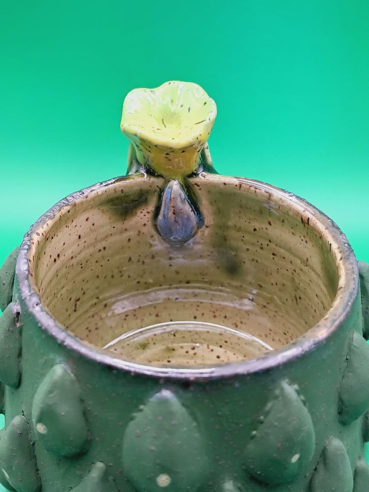 These mugs are a sculptural abstraction of the beautiful prickly pear cacti that surround me in the Southwest. Wheelthrown, sculpted, handpainted with foodsafe glazes (gloss interior and handle with a velvet matte exterior.) Microwave and dishwasher safe, handle with love.