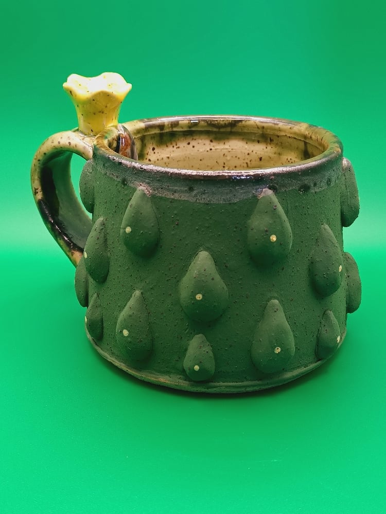 These mugs are a sculptural abstraction of the beautiful prickly pear cacti that surround me in the Southwest. Wheelthrown, sculpted, handpainted with foodsafe glazes (gloss interior and handle with a velvet matte exterior.) Microwave and dishwasher safe, handle with love.